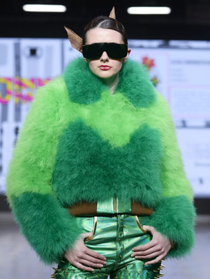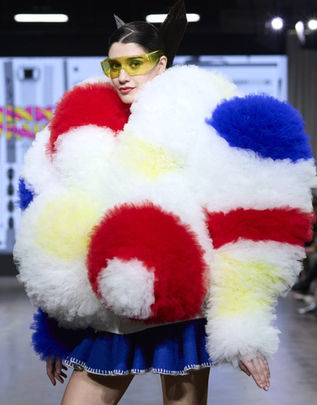 On the runway, bold prints, playful appliqués, and sculptural textures brought this world to life. Familiar characters appeared across garments in unexpected ways, woven into oversized silhouettes and graphic compositions that balanced humour with craftsmanship. Plush materials, vibrant surfaces, and exaggerated forms created a sense of movement and joy, as if the garments themselves carried the spirit of animation.