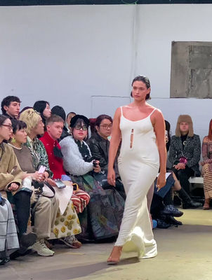As spring approaches, we experience a thaw. Models come out of a hibernation of sorts, pushing back against cultural discourse which screams that "thin is back!" Draped fabrics mimic the language of melting. Jewellery takes the shape of dried flowers coated in resin, beads of water suspended in mid-drip. The colour palette of blacks, dark blues, greys and whites recalls the moment when winter starts to give way. When the wind no longer bites and the sky feels inviting again. That first whisper of warmth and hope after an onslaught of grey days.